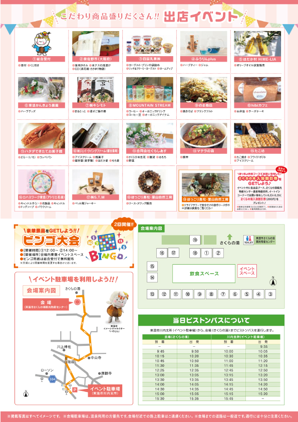 イベント当日に各出店ブース・さくらの湯観光物産センター(農産物直売所・イートインコーナー)にてお買い物をしていただいた方、当日開催のワークショップ参加者にさくらの湯入浴割引券をプレゼント!